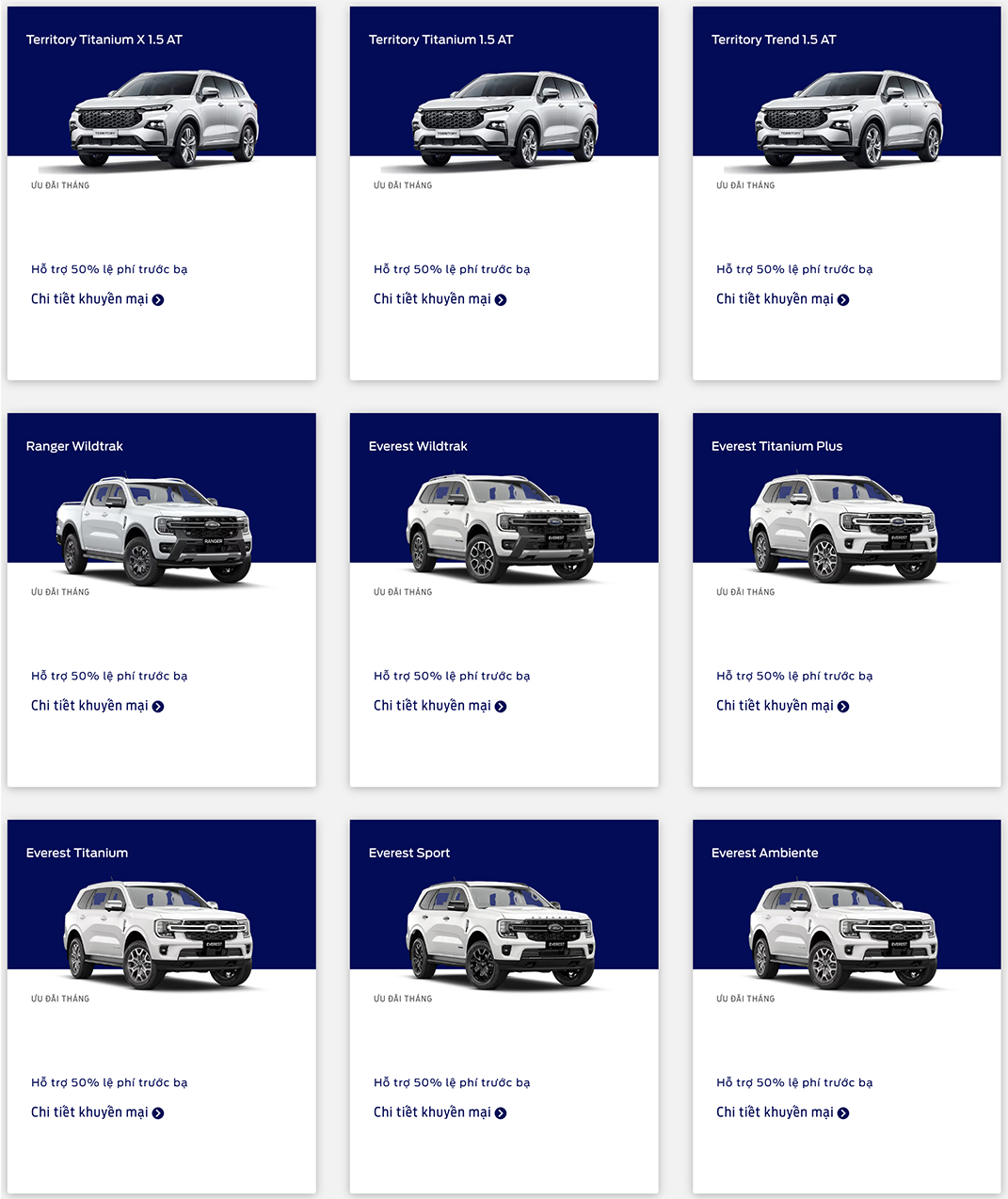 Territory và Ranger Wildtrak: Kết hợp cùng mức giảm lệ phí trước bạ 50% từ chính phủ, Ford Việt Nam triển khai chương trình khuyến mại nâng tổng ưu đãi được hưởng lên đến 100% lệ phí trước bạ. Chương trình có hiệu lực từ từ 08/07 đến 31/07/2023.
